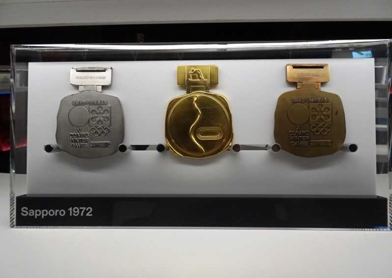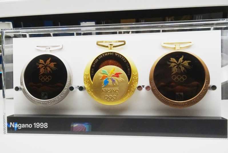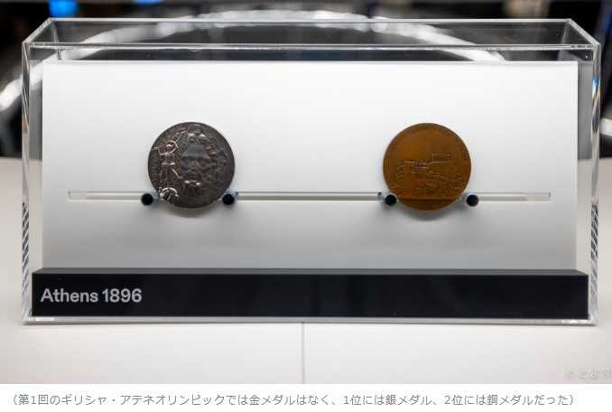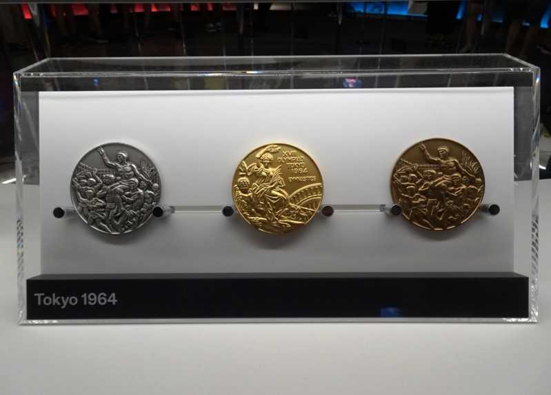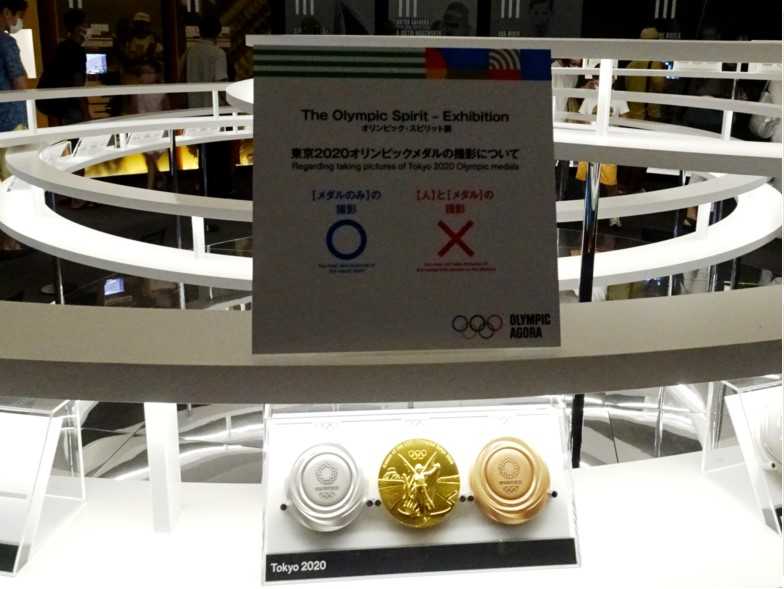 並びの最後は、「東京オリンピック」のメダル、中央の金メダルが表面で、両サイドの銀と銅メダルが裏面で展示しています。