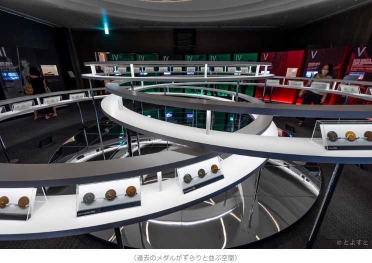 次は、ZOOM 04、「オリンピアンズ」、東京2020大会を含む過去のメダルがずらりと並ぶ空間です。