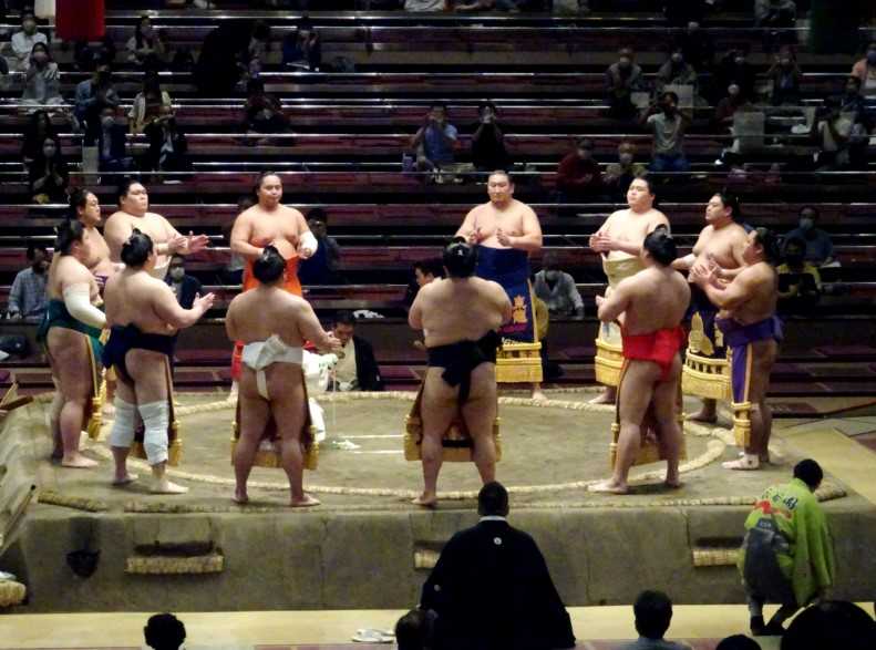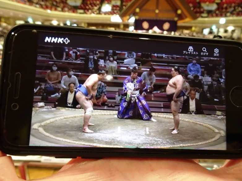 <スマホで、「NHK+」の大相撲を観ながら観戦、左が東龍関>