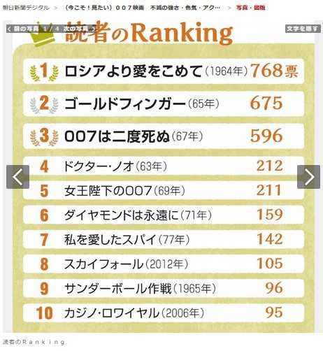 作品別では初期の作品が上位にランクイン。1位は第2作「ロシアより愛をこめて」。実はこの作品、日本初公開時のタイトルは「危機一発」(※「一髪」ではない)。リバイバル時に原題にした。