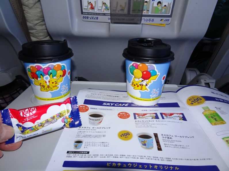 そして、暫くすると、ドリンクサービスが始まります。ネスカフェゴールドコーヒーと、ピカチュー模様のキットカットが無料でいただけます。機内誌にはコーヒー100円の文字が有りますが・・・。