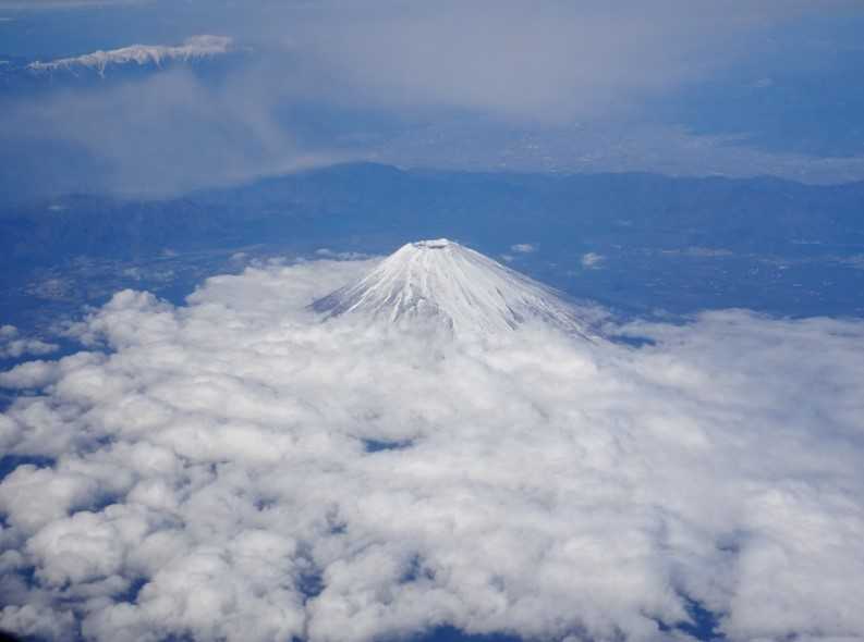 間もなく、妻が窓の外を指差します。富士山です。窓際、それも右側で、きれいな富士山が見えます。
