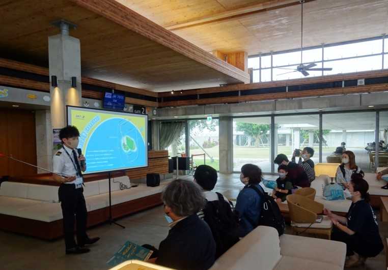 9時半、空港内の見学、カウンター前で特別航空教室が始まります。