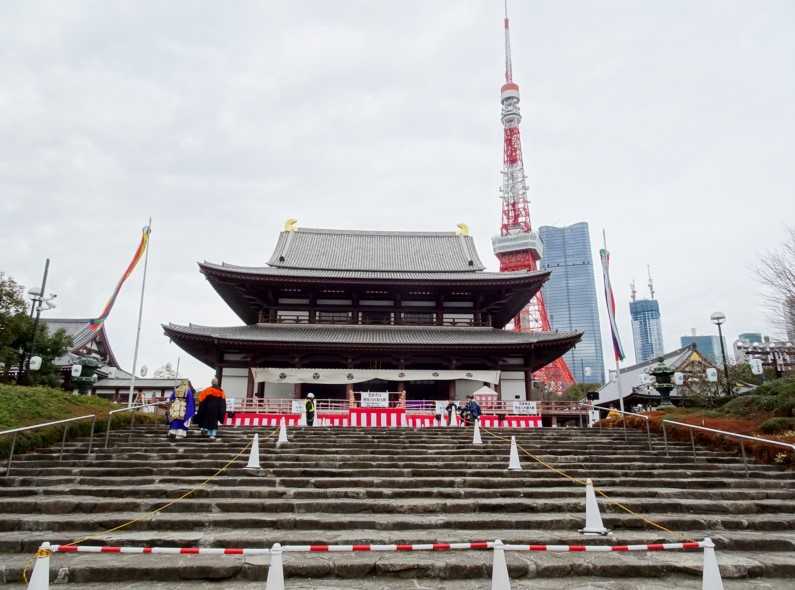 散華を拾いたい気持ちをこらえて拾わず、、東京タワーを背景にした「大殿」前の石段を上ります
