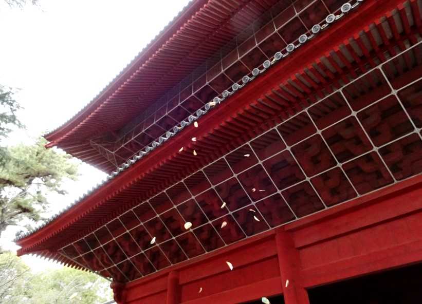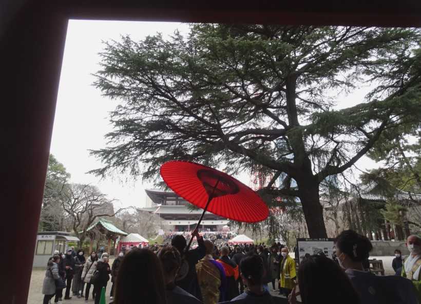 そして、笙 篳篥の優雅な音に導かれて、お練り行列、慈雲閣(開山堂)を出て、日比谷通りに沿って歩き、丹漆(たんしつ)の「三門(三解脱門・重要文化財)」を潜って境内に入ると、門の上から僧侶達による散華を撒かれます。