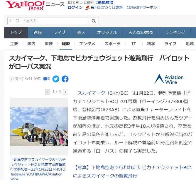 翌日、ピカチュウジェット遊覧飛行のヤフーニュースが流れ、我々の姿が少し写っていたのを思い出します。