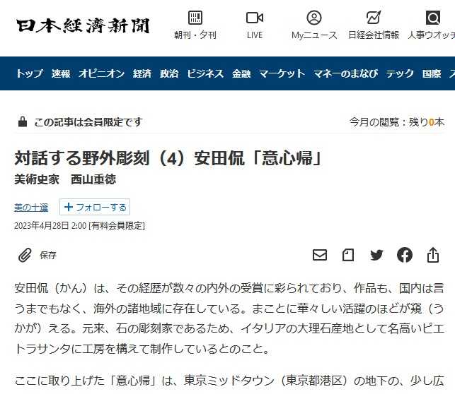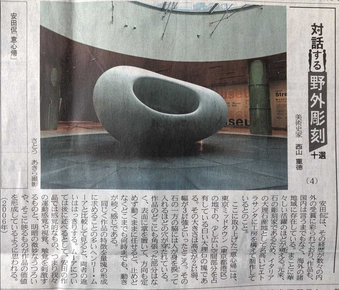 4月28日の日経新聞「美の十選」対話する野外彫刻(4)は安田侃「意心帰」が掲載されました。