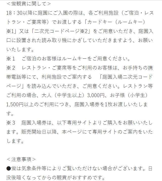 毎年、ホタルを楽しんでいますが、宿泊者限定の条件は初めてです。