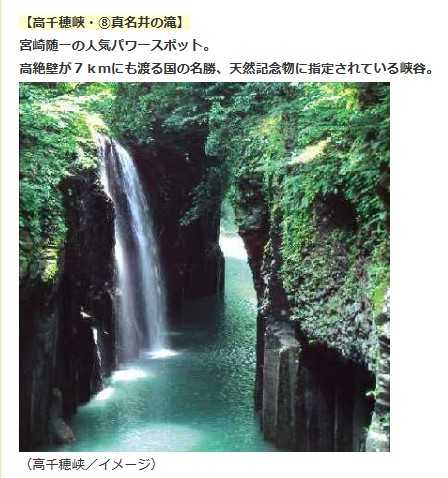 【高千穂峡・⑧真名井の滝】:宮崎随一の人気パワースポット。高絶壁が7kmに渡る国の名勝、天然記念物指定の峡谷。