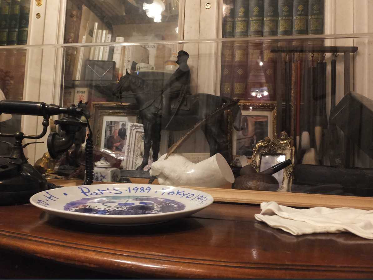 左の壁には、コーマル城で展覧会を開催したときに制作された早川義孝氏のタペストリーがかけられ、机の上には、黒田長久氏の形見分けとして贈られた、北村西望氏作の閑院宮の騎馬像が置かれています。