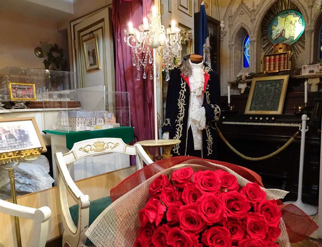 ここは、サロン文化賞を受賞され亡くなられた先生方を祭る学問の礼拝堂、当館と姉妹協定を結ぶブルトウィユ城のチャペルを縮小、締結10周年を記念し、1995年館主自ら礼拝堂内を彫刻、建築したとのことです。