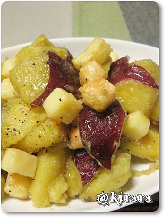 [料理] ブログ村キーワード[お弁当] ブログ村キーワード[モニター] ブログ村キーワード レシピブログ×小岩井乳業さんのコラボモニターで「小岩井 こんがり焼けるチーズ」を5袋もいただき先日 1品を投稿しましたが子供たちは焼いてそのまま食べるのが1番らしいのですが5袋いただいたので もう1品くらいはと。。。今が旬のさつま芋と合わせてみました「 ◆焼けるチーズ&さつま芋のメープル♪ 」材料:(画像の量の約2倍分です) 「小岩井 こんがり焼けるチーズ」 1袋 さつま芋 2本(800g位でした) バター又はマーガリン 大さじ2 油 小さじ1 塩胡椒(粗引き黒胡椒) 小さじ1 メープルシロップ 大さじ3~1)さつま芋を小さめの一口大の乱切りにして 水に10分位さらしてあく抜きをする2)深型フライパンに水50CCくらいと あく抜きしたさつま芋 バター大さじ1を入れて蓋をして蒸し煮(中火で約10分位) 時々上下を優しく返す(途中で水がなくなって来たら少量を足して串が通るまで蒸し煮にする)3)2をしている間に焼けるチーズをオーブンなどで焼いておく 4)2のさつま芋に串が通るようになったら 皿に取り出して置く5)4で空いたフライパンにバターと油を入れて溶かし 溶けたらメープルシロップを大さじ2を入れて混ぜたら 4のさつま芋を戻し 塩胡椒をして絡める 6)盛り付けたら大さじ1くらいのメープルを上からかける メープルの量は さつま芋の甘さで違うので 5の時点で一つ食べて さつま芋の甘さを確認して 好みの甘さになるように調節してください ちょっと多いくらいのメープルの方が チーズと塩胡椒の塩分とで 甘しょっぱくて美味しいですよん^^ 先日TVで さつま芋はとってもあくが強いので綺麗な黄色に仕上げるのには出来れば30分以上水にさらしてあく抜きをした方がいいそうです高級料亭の金とんなどに使うさつま芋は1晩くらいさらしておくそうですよん^^ちょっと多いかなぁ~って思いながらも子供たちは さつま芋好きだしってことで。。。おかずにはならない感じですが美味し~と言って ご飯の途中ではし休めに食べたりご飯後につまんで食べたりして画像の皿で 2皿分が出来上がりましたがお弁当に入れる分を取り起きした分以外は完食!!チーズはあった方が美味しいですが無くてもOKいも好きさんは是非どうぞ~♪♪ やみつきになるかも(●´艸`)ププ本当はお弁当に入れた画像とともにUPしたかったのですがお弁当紹介が遅れていて その日まで追い付かずモニターの投稿も明日までになってしまったので。。。。゚(゚´(00)`゚)゚。ぶひぃーんクックパッドの私のページは ⇒ 【MYキッチン】レシピブログの私のページは ⇒ レシピブログさんのシステムが変わり ランキングボタンから【myレシピブック】に飛べるようになりましたブログランキングに参加していますいつも 訪問・コメント応援ありがとうございます♪ブログ更新の励みになっています^^ 【ランキングバナー】⇒myレシピブックの今日の足あとをポチッてぜひ見に行ってくださった足跡を残してください後ほどこちらからもお邪魔させてくださいね♪♪