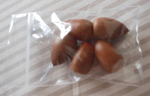 普段、買い物に行くスーパーの中で、結構小さな食品スーパーがある。床屋くらいの広さかな?今日は、3軒目に、そのスーパーに行った。娘(3歳2か月)が「疲れちゃった。ここで待ってる」スーパーの出口近くの前で座った。前にも一度、そこで待ってたことがあった。私がまず、店の外の商品を見てると「いーち、さーん、ごー、よーん・・・」数を数え始めた。順番間違ってるけど(^^;おじいちゃんに話しかけられて、どんぐりが何とかって言ってた。私は、中に入る時に、娘に声をかけて、本当に一人で待っているのか確認したら、娘は1人で待ってるって言うから、中に入った。店から出ると娘が「どんぐりもらったー!」手には、小さなジッパー付き袋を持ってて、どんぐりが5個入ってた。あ、さっき、おじいちゃんに、どんぐりもらってたのか。「ちゃんと、ありがとう。って言った?」「言った!」知らない人に話しかけられると、おとなしいから、言ってなさそうな気がするけど。。。見ると、結構大きなどんぐりだった。普通の近所で良く拾うのが、横幅(太い部分)が1cmくらいで、これは、1.3cmくらい。ビニールに入れてるし、どんぐりで何か作ってる人なのかな?ちなみに娘に、「誰にもらったの?」って言ったら、「わからない」って言われた。そこで、答えやすいように、「おじいちゃん?」「おばあちゃん?」「ママみたいな人?」「パパみたいな人?」「小さい子?」順番に聞いても「分からない」って言われた。まだ難しいか(^^;