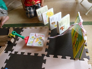 息子(小学校3年生)がピタゴラスイッチを作りたがって、私も、作りたいと思ってて、夏休みにやってみようか?って話になってるんだけど、その前に、いろんな技を、少しずつ実験してみることにしてる。今日は初めてやった。娘(3歳2か月)もピタゴラスイッチにハマってるから、月曜日のものを録画してるから、それを見たり、youtubeにアップされてるのを見たり。電車のおもちゃはあるから、それを使うことにした。息子も私もそれぞれ考えて、息子は、色々考えたけど、上手に出来る方法が定まらず、でも、少しずつ、案は出すことが出来た。あとは、どうやって確実に成功するものを作るか。今日は、私が1つ作った。とりあえず、線路の坂の上の車を押して走らせたかった。娘が出して、ちょうど近くに置いてあった、砂場の砂を掘るやつ(シャベルじゃない方)で押そうと思って、(名前分からないから、とりあえず、フォークということで)それを抑えておくものを探した。本がいいかな?と思って、本を置いた。本をどかすと、フォークが倒れるから、今度は、本をどかす方法。そこで、紐で大きい本とつないで、大きい本に引っ張ってもらうことにした。大きい本を倒すために、本でドミノを作って、からくり一つ完成☆別に、後ろから作ろうと思ってたわけじゃないけど、結果的に、後ろから順番に組み立てていった。「次何しよう?」じゃなくて、「これを動かすにはどうしたら良いのか?」って考え方。本のドミノを倒して、大きい本を倒すと、紐に引っ張られて、フォークの上の本がどいて、フォークが倒れて、黄色い車が発車する。