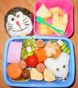 今日は、息子(小学校3年生)が市内見学で、お弁当。お弁当を作ってたら、息子が「今日は絵にしなくていいよ」「あ、もうドラえもんいるけど(^^;」ちょうど出来上がったドラえもんおにぎりを見せた。「もう、絵は笑われたりしないかな?」「笑われはしないと思うよ。」(一緒にお弁当食べるグループ、女の子だけだし)「お弁当箱も見たい」「お風呂から出たら出来てるだろうから、早く入ってきなよ」で、結果的に、満足してた(笑)帰って来て、お弁当箱を洗ってる時、「次にお弁当作る時は、キャラクターじゃなくていいんだよね?」って確認したら、「いや、その時に確認して」って言われた。箱外(5cmくらいの太さに切った厚紙をくるっと巻いて、崩れないようにした)ドラえもんは、うめふりかけをサンド。 目はかまぼこ&のり、鼻と首輪は笹かまぼこ、鈴は卵、あとはのりで装飾。お弁当箱ご飯は、ドラえもんの嫌いなネズミ。 間にサンドしたのは、何ふりかけか忘れた。のりで装飾。左上には、どこでもドア。かまぼこで作った。下にもう1個かまぼこが入ってる。左下には、カップに入れた、ミートボール3個。真ん中の下には、卵焼き。三角はわざとじゃなくて、上手く長丸にならなかった。右上のカップには、からあげ。どこでもドアの隣には、塩ゆでブロッコリー。人参は、クッキー型で、 ブロッコリーの横の隙間に2個と、ミートボールの上に1個周りに切り込みを入れたウインナー3つ。枝豆3個をピックに指して、右上に。ミニトマトを忘れてて、 枝豆1個とミニトマトをピックに指してブロッコリーを少し開けて入れた。タッパーパイナップル。1個が大きかったから、半分に切ったのを入れた。楽天レシピで“お弁当”検索しようデコ弁 キャラ弁 グッズ お弁当 グッズ!ウインナーがかわいく変身!ウインナーカッター ミッキ...価格:315円(税込、送料別)お弁当をもっと楽しくかわいく飾りたい!お弁当、キャラ弁に大活躍!「にこにこパンチ3」価格:892円(税込、送料別)上と横で違ってみえる!可愛い動物がスイーツに大変身!?おかしなピックス8本入'キャラ弁 キ...価格:115円(税込、送料別)【子育て】【お弁当】