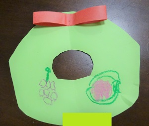 今日は、幼稚園で製作したリースを持って来た。先月は娘(幼稚園年長)が拗ねててあまり工作をやりたがらなくて、「12月は寂しい感じになると思います」って先生が言ってたんだけど、本当に寂しい感じだった(笑)ぶどうと、緑の浮き輪&ピンクのプールが描いてあった。