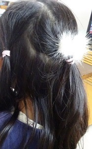 娘(幼稚園年長)は髪の毛を後ろに留めるのは一人でやってるけど、リボンやピンを使って結ぶのもやり始めた。月曜日に幼稚園が休みだから自分でやったんだけど、火曜は体操だから私が結んで、水・木・金と自分で結んで行った。月曜日水曜日紫のピン落としたけど、今朝先生に言ったら拾っておいてくれた。木曜日は写真撮ってないんだけど、左右のピンクのゴムの部分が小さい三つ編み。白い大きなボタンのゴムで後ろに1本にまとめて、白いふわふわの付いたピンは、左右のゴムの所にさしてた。金曜日
