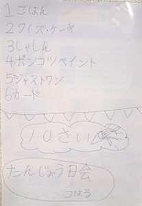 今日は娘(小学校4年生)の誕生日会。娘の作ったプログラム。両隣に、前に誕生日会で描いて飾った絵を貼ってみた。まずは食事。3年連続、ハンバーガーを作って食べることになった。娘(小学校4年生)はピクルスをたくさん食べて、ポテトも食べて満足。ケーキはいつものように作った。フルーツはいちご、みかん、パイン。上にプレートを置きたいって言うから、プレートを買ってきてチョコペンで名前を書いた。私は元々字が上手くないから上手く書けてはいないんだけど、「ママすごい上手!」って喜んでた。数年後、ママの字が汚いことに気づくと思うんだけど。クイズは、猫に関するクイズ。娘がゲームで使う名前を猫に関する名前にしてるから。https://plaza.rakuten.co.jp/imoimoco/diary/202404070002/10問やった結果、パパ 1問正解息子(高校1年生) 3問正解娘 4問正解娘の友だち 3問正解ということで、娘の勝ち!いつものことだけど「娘の友だち」は娘のサブ垢と思えば良いのかな?3択なんだけど、娘は自分と友だちの文を答えるから、合わせると正解率が高い。もうこのハンデいらないと思うんだけど、まだ娘はやめない。次に家族で写真撮影。前回は、間違えて動画を回しちゃったけど、今日はちゃんと撮影できた。今日のゲームはネットで見つけたゲーム2つ。まずは『ポンコツペイント』3人(ABC)が絵を描いて、一人(D)が当てるゲーム。ABCが共通のお題を見て、絵を描くんだけど、丸(長丸は駄目)とまっすぐの線だけしか使っちゃいけない。っていう縛り付きで描く。描き終わったら何画で描けたか数える。丸は1個1画、線は1本1画(1回曲がったら2画になるから、四角形を描いたら4画)例えば、Aの絵が15画、Bが10画、Cが17画だったとしたら、まず、一番画数が少ないBが絵を見せて、Dに何の絵か当ててもらう。当てられたらBが勝ち。分からなかったり外れたりしたら、次は15画のAが見せる。当てられた人が勝ちで、全員当てられなかったら全員アウト。少ない画数だと何の絵か分かりづらいけど、一番最初に見せることが出来て、当てられるチャンスが来る。画数が多ければ、細かい絵が描けるから、正解率は高いけど、画数の少ない人が上手に描いて当てられたら、見せる前に終わっちゃう。画数をどうするかの判断も大事なゲーム。もう一つは『ジャストワン』これもポンコツペイントと同じようにお題があって1人が答える形式。ABCは、お題の単語を見て、連想したものを3つ書く(絵ではなく字)書いたら3人で見せ合う。例えばお題が「えんぴつ」で、Aが「勉強」「お絵かき」Bが「木」「長細い」Cが「勉強」「学校」って書いたとする。AとCの「勉強」が被ってるから、Dに見せることが出来ない。つまり、Dが見た時にはAが「お絵描き」Bが「木」「長細い」Cが「学校」って状態になってるから、4つのヒントからお題が何か答えるもの。点数の付け方は、勝手に考えてつけたから、実際の遊びとは違うかもしれないけど、出題の時に被ったら、被った数マイナス。つまり、この場合、AとCがマイナス1。で、答えるDは、当てたらプラス1。ってやった。パパ -1ママ -3息子 -3娘 0ってことで、0点だけど娘の勝ち。点数の付け方、絶対間違ってるよねwちなみにどちらのゲームもお題をくじ引きで決めたんだけど、くじを誰かが作ると答えが分かっちゃうから、幼児が単語の勉強をするのに使うマグネットを引いて決めた。次はカード。表紙0歳1歳・・・10歳まで続く今回は0歳から10歳までの、みんなで見て楽しめるカード。懐かしの写真や思い出がいっぱいあるから。https://plaza.rakuten.co.jp/imoimoco/diary/202404070003/広げるとめっちゃ長くなる。3mくらいあるかな?娘が0歳の方からカードに沿って歩いたんだけど、0歳の方はハイハイで、だんだん大きくなって最後の10歳で普通に立ってて、戻るときは、10歳の部分で普通に立ってて、年齢が下がるほど背が低くなってハイハイしてた。ドラえもんのガリバートンネルみたい。ってことで、今日の誕生日会は終了した。