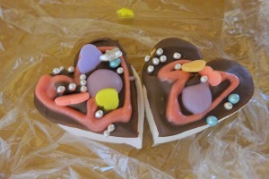 ハートのマシュマロにチョコをつけて、チョコペンでハートを描いて、