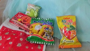 で、サンタさんがクリスマスプレゼントのおやつを渡してくれた。