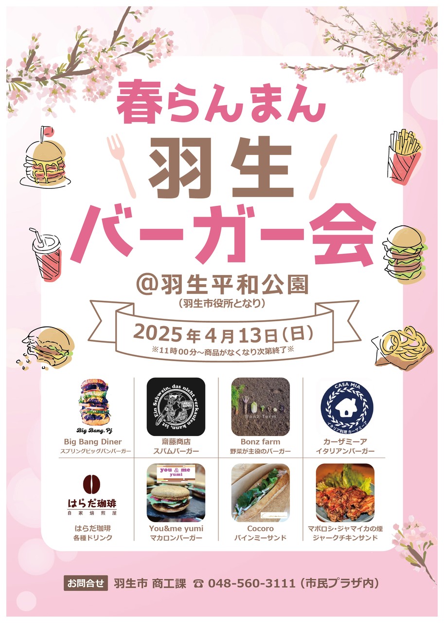 羽生市LINEのお知らせ「ハンバーガーイベント」の紹介。とまり木パークプロジェクトを活用し、羽生平和公園でハンバーガーイベントが開催されます。普段ハンバーガーに携わらない職業の方が、自分の職業をテーマとしたハンバーガーを提供するイベントです。▼日時 4月13日(日) 11時から商品がなくなり次第終了※雨天決行▼場所 羽生平和公園▼出店者 Big Bang Diner、齋藤商店、Bonz farm、カーザミーア、はらだ珈琲、You&me yumi,、Cocoro、マボロシ・ジャマイカの煙▼問合せ出店の許認可や調査:建設課(内線253)出店の広報:商工課(048-560-3111)クリックして拡大 ↓