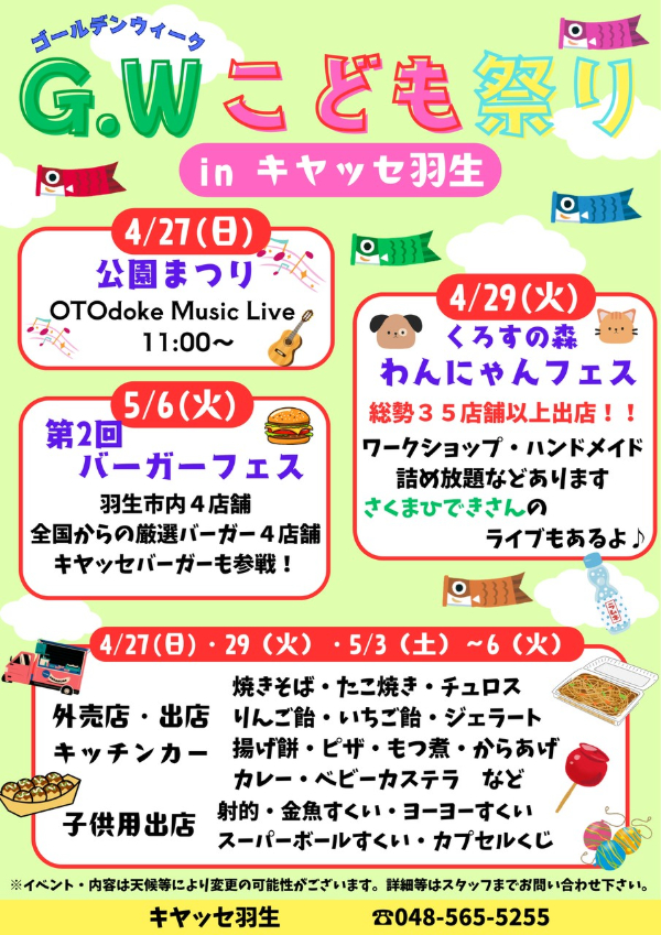 羽生市LINEのお知らせ「キヤッセ羽生GWこども祭り」の紹介。「キヤッセ羽生GWこども祭り」▼日時 4月27日(日)~5月6日(火・祝日)の土日祝日 10時~15時▼場所 キヤッセ羽生▼内容 GWこども祭りを開催いたします。こども用出店(射的、金魚すくい、ヨーヨーすくい、スーパーボールすくい)、おなじみの出店(焼きそば、たこ焼き、りんご飴、ジェラートなど)、音楽イベントなどをご用意しております。皆様のご来園をお待ちしています。▼問合せ キヤッセ羽生(048-565-5255)https://kiyasse.jp/