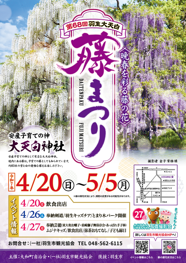 大天白神社の藤まつりが、4月20日〜5月5日に開催される。一時は虫だか病気だか分からないけれど、それにやられて花が殆ど咲かない状態に陥ってしまったが、昨年は平時の50%程度まで持ち直してきた。今年の藤は、どのくらい咲くだろう?大和町自治会と(一社)羽生市観光協会の主催で「大天白(だいてんばく)藤まつり」を開催します。安産子育ての神として有名な大天白神社の境内にある大天白公園の藤は、子育て藤としても知られています。公園中央の噴水池の周りを囲むように約60本の紫と白の藤が藤棚を優雅に伝い、立ち藤やダルマフジも見ることができます。【期 間】 令和7年4月20日(日)~5月5日(月)【場 所】 羽生市大天白公園【主催・後援】 主催:大和町自治会・(一社)羽生市観光協会 後援:羽生市【問い合わせ】(一社)羽生市観光協会 電話:048-562-6115 メール:info@hanyu-kanko.jp藤の開花状況はここをクリックして確認してシルブプレ。ちょっと分かりにくいけど。(苦笑)