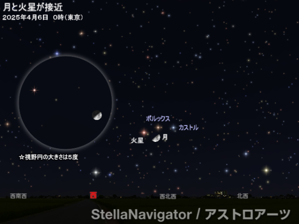 4月5日の夕方から6日の未明、月齢7の上弦の半月と火星が接近して見える。1月の地球最接近から3か月が過ぎ、火星は0.5等級まで暗くなったが、肉眼でもよく見える明るさだ。肉眼や双眼鏡で、ふたご座のポルックス、カストルと合わせての共演の様子を楽しもう。