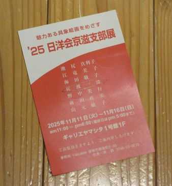 『日洋会京滋支部展2025』この7人ほどのグループ絵画展は毎年開催されている。今年は11月11日~11月16日の期間で開催される。友人が出品しているので、わたしも毎年京都市内寺町の画廊へ観に行くことにしている。この友人は滋賀県彦根在住で私と大学の同窓で、日展の油彩部門の審査員にもなっている人です。彼からいただいた案内状に ”13日と16日には在廊する” とありましたので、わたしは13日に京大病院に行く予定ですので、その帰りに覗いてこようと思っているのです。彼はわたしの個展にもわざわざ彦根から顔を見せてくれる、律儀なところのある友人です。画廊で彼と会えるかどうかは分かりませんが、この絵画展での彼の出品作品を観れば、今年彼が『秋の日展』に出す作品の傾向が分かると思っています。