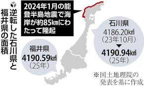 都道府県の各面積で一番広いのは当然北海道です。では一番狭いのは? かなり以前までは『香川県』と『大阪府』が最下位を競っていたのですが、大阪府の関西国際空港の完成と同時に、その面積が加算されて『香川県』が一番狭い県ということになっています。因みにわたしはこの話は知っていました。でも、先日のニュースで過日の ”能登半島大地震” であちこちの海岸で地盤が隆起したところがあるとのことで、その隆起して増えた面積をプラスすると『石川県』が『福井県』を追い抜いて34位になったというニュースが有りました。わたしはそのニュースを聞くまで『石川県』と『福井県』の面積がほぼ似たようなものだったということをまったく知りませんでした。都道府県の各面積のことなんて、ほとんど気にしないで今日まで生きて来ましたから、改めて聞くと「へぇ~そうなんか~」と思ってしまいますが、この話はきっと忘れないと思います。