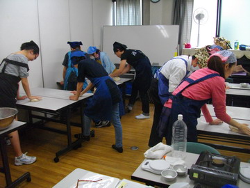 4月下旬から、求職者支援の一環としてパンの実習を頼まれ、久し振りの先生してます。年齢さもかなり幅がありますが家族的ムードで楽しく、そして勉強になる?授業を進めています。9名の生徒さんを相手に、好き勝手にやらせて貰ってます。作業環境は決して恵まれてはいませんが、工夫次第!どんな場所でも何とか実習をしてしまいます。21回の授業ですが、すでに半分以上を消化して7月18日が最後の授業となります。最後はパンシュルプリーズを作ってサンドイッチに・・・茶話会形式で楽しく終了したいと思っています。写真は熱心な9名の生徒さんの実習風景です。 パン屋の親父より!!