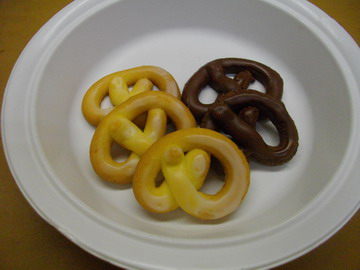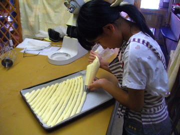 今日の授業は、ちょっと難しい絞りクッキー。生地作りは通常のクッキーとまったく同じ。バターと砂糖(今回は粉糖)をすり合わせ、卵を加えて粉を入れ練り過ぎないように、粉を合わせる。少々硬めの生地なので、絞り袋に沢山入れてしまうと大変。ひらがなの、『の』の字を描くように少し高いところから絞る。なかなか言うことを利いてくれません。絞れたところで窯に入れ約15分程で焼き上げます。温かなうちに、ウォーターグラスで仕上げて出来上がりです。写真は生徒さんの作品ですが、結構上手に仕上がっています。 パン屋の親父より!!