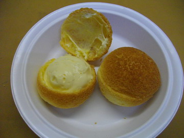 久々のメニューでした。通常のシュークリームとは少々違います。クリームはクリームムースリーヌ(キメ細やかなクリーム)シュー生地は牛乳と水をブレンドしたもの。更に、絞り終えた生地の上に、クッキー生地をのせて焼きます。そのクッキー生地にも特徴があり、卵が入らない配合です。配合はバター・砂糖・粉が同割(つまり同じ分量)クリームはカスタードクリームに、生クリームをタップリ。その割合は、牛乳量の約60%の生クリームです。最後に生クリームとカスタードクリームを合わせますが木べラで合わせるほうが、軽めにあわせることが出来ます。ちょっと形は大きいものが多かったのですが、試食の時間では皆さん口をそろえて「美味しい」・・・でした。 パン屋の親父より!!