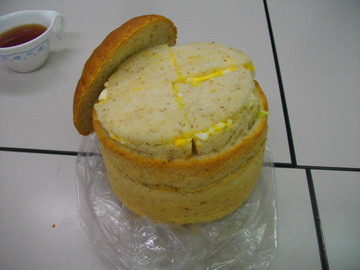 求職者支援事業でパンの先生をした最後の日。この日はちょっと遊び心を発揮してティーパーティーを。スポンジを焼く型(今回は15cm)でパンを焼きました。ライ麦を10%入れた生地で・・・中身をくり抜いて、スライスしてサンドイッチにします更にサンドしたものを元の形に戻します。蓋を開けてみて、びっくり!!というのがこのパンの特徴。皆でサンドイッチを食べ、楽しい時間を過ごしました。これで、今回の21回にわたる先生は終了しました。 パン屋の親父より!!