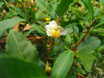 先日、知り合いと静岡に行ってきました。目的は色々でした。静岡と言えば・・・そうお茶。お茶農家さんを尋ねたり、お茶の作法(煎茶)を体験したり、タップリ10時間の観光プラス・・・でした。写真の花は「お茶の花」です。勿論お茶農家さんでは絶対に見られないものです。お茶は葉が命。若芽を摘んでお茶にするのですから花を咲かせてしまう事はつまり手入れをしていないと言う事。恥ずかしいことなのです。これはある施設の垣根として育てられていたものです。決してお茶農家さんのものではありませんので念のため!! パン屋の親父より!!