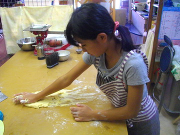 夏休み特別企画。小学生高学年、中学生対象のお菓子教室。残念ながら参加者はごく少数でしたが、今日のフルーツロールの授業には未来に期待が持てる女の子。お菓子が好きで、自分でも作りたいとの希望からお母さんがお電話してくださいました。早速授業に入りましたが、目は初めから輝いていました。少しアドバイスしただけで、上手に作業していました。ロールにする時に少し難しかったとのことでしたが、なんのなんの、上手に巻けていました。試食をして、家族5人分のロールケーキを持って帰ってゆきました。明日はチョココルネ(パン)に挑戦です。午前中塾に行って、その足でお菓子・パン教室に来ます。素直でとっても優しそうな女の子でした。 パン屋の親父より!!