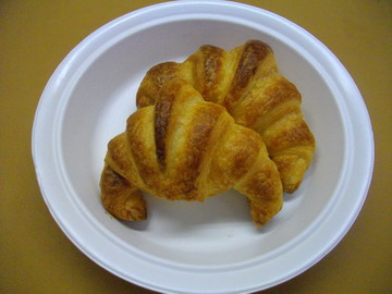 常温で作ることが、これからしずらくなる季節。それは、折り生地(デニッシュ、クロワッサン等)ご存知のようにバターの融点は26度とされています。これから気温が上昇すると、冷蔵庫から出してからの時間が長ければ長いほど製品に悪い影響が出てきます。バターが柔らかくなると、生地が延びにくくなり更に、無理をすると生地からバターが出てきてしまいテーブルに生地が付着してしまいます。それを防ぐ為に手粉を沢山使ってしまいます。すると、せっかくの配合バランスが崩れてしまいます。更に更に、製品の透明感が失われてしまいます。意外とクロワッサンは手ごわい相手なんです。幸い今日の室温も低かったので、作業性に問題なし。あまり慣れていない作業の割には上手に作れました。製品に透明感もあり、食感も上々の出来でした。生地の仕込みも時間内に終了し、お持ち帰りできました。 パン屋の親父より!!