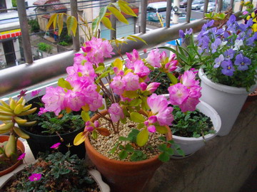 3年前に群馬の産直で購入した久留米ツツジ。元は大株で植木職人さん曰く、この値段じゃ袋代にもならねえよ。と、笑顔で大きな袋に入れてくれました。勿論我が家では場所が無く、持ち帰ることが出来ません。購入の際初めからTさんの庭に植えていただくつもりでした。そして、Tさんは花が終わった後、挿し木をして下さいました。根付いたころに頂いてきましたが、去年は1箇所だけ。でも、今年はご覧の通り沢山花を咲かせてくれました。花が終わったら植え替えをしようと思っています。花の色と、形が気に入って購入しました。今、我が家のベランダは、モンタナ(クレマチス)、コテマリアジュガ(西洋十二単)、タツナミソウ等が真っ盛り。いよいよ、ベランダガーデニング時期の到来です。 パン屋の親父より!!