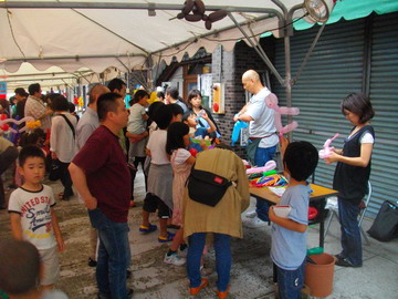 今年も夜店祭りが行われました。年々参加する意欲を失う店舗が増えています。自分の事で精一杯なのでしょうが、たった一日。勿論企画から準備に至るまでは、時間がかかります。でも、お客様への感謝も含めての夜店祭り。子供達も楽しみにしているのですから・・・何としてでも、続けてゆく覚悟です。今回新たな試みとして、風船アートのパフォーマンス。何とかお願いをして、実施となりました。目の前で作られる風船アートはいつも大人気です。 パン屋の親父より!!