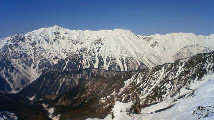 実は、昨日の午後から休みを取って、西穂高岳独標に行ってきました。昨日の夕方、高山行きの高速バスで平湯温泉へ。1泊して、今朝新穂高温泉へ、ロープウェーで西穂高口まで行って、西穂独標まで往復、という計画だったのですが、いろいろと齟齬がありまして、結果的にはタイトルのとおり、山頂目前にして、引き返してきました。最大の齟齬は、そもそも、昨日午後からしか休みが取れなかったことですよ。そりゃもちろん、出来ることなら昨日朝から休みを取りたかったのですが、仕事上の都合が色々ありましてね。そういうわけで、昨日は平湯温泉に泊まり、今朝新穂高温泉に向かいました。天気は快晴、こりゃ最高の登山日和だなとおもって、新穂高温泉に到着したら・・・・・・。ロープウェーの客待ちがとんでもないことになっていました。ロープウェーの始発が9時で、私は8時半に着いたにもかかわらず、その時点ですでにものすごい客待ちの行列。その大半は団体ツアー客です。ひたすら待つ待つ待つ。で、結局ロープウェーに乗れたのは10時過ぎ。つまり当初の予定より1時間遅れてしまいました。あの乗客がみんな登山者だったら、登山道は大変なことになっているところですが、実際にはもちろん乗客の95%は一般観光客で、登山者は20人に一人くらいでした。それでも、登山者は結構多かったですけれど。2本のロープウェーを乗り継いで、歩き始めたときはもう11時近かったかも知れません。この段階で「独標までは多分無理だなあ」と思ったのですが、とにかく歩き始めました。朝、ロープウェーを待っている段階では、稜線上はものすごい雪煙が渦を巻いていたので、「こりゃすごく風が強そうだなあ」と思ったのですが(ロープウェーも、強風のため速度を落として運行と、言っていました)、歩き出してみると、風がほとんど止まってしまいました。西穂山荘について12時。稜線上に出れば当然風があるだろうと思っていましたが、やっぱり風はありません。天気は快晴、最高の登山日和です。目指す西穂独標は、目の前にあります。感覚的には、無雪期よりも近くに見えました。多分、こんなに天気が良くて、かつこんなに風がない日なんて、おそらく一冬に1度あるかどうかってところでしょう。でも、西穂山荘から上は急斜面なので、さすがにペースが落ちました。風がなくてぽかぽか陽気だけど、足下の雪面はカチカチのアイスバーンで、斜度も結構あります。どんどん登って、独標直下にたどり着いたのが1時半。岩場のトラバースを超えて、目の前の独標を見上げたら、「うーーーーん、これに登るのは、ちょっと無理かなあ」と思いました。時間的にちょっとね。技術的にも、正直言って自信がなかった。慎重にゆっくり登って、それ以上に慎重にくだれば、全然無理とは思わなかったけど、時間に追われている状況では、それは無理。うーん、西穂山荘に1泊しようかなあ。でも相棒には今日中に帰ると言って出てきたので、無断延泊なんかしたら、家庭内の平和が・・・・・・。それに、明日は天気が崩れるという予報だし。そういえば、つい2週間ほど前、ここで滑落事故が報じられていたなあ。なーんてことをあれこれ考えて、結局山頂100m手前(いや、もっと近かったかも知れません)から引き返してしまいました。西穂高岳独標は、西穂本峰の手前の手前の・・・・・・山(いくつ手前のピークなのか、正確には知りませんが)なので、「山頂」と言っても山頂ではないんですよね。で、下山してみたら、ロープウェーは相変わらず長蛇の列でした。まあ、これだけ天気が良ければお客さんが多いのは当然かも知れませんが。写真も撮りましたが、例によってリバーサルフィルムなので後悔に時間がかかります。とりあえずは携帯で撮った写真など。※もともと強い日差しで液晶画面が見にくい上に、その対策のためサングラスをかけているから、写真を撮っているとき携帯の液晶画面はまったく見えていません。写っているんだかいないんだか、手ぶれしているかいないか、まったく分からずにシャッターを切っているんだから、写真の質についてはご容赦を。(そのうちに、ちゃんとした写真もアップします)左が笠ヶ岳、中央右側は多分双六岳でしょう。撮影場所からは北西方向になります。上記とは正反対に南東方向に向けて。霞沢岳です。手前の谷底が上高地になります。上高地を撮ったつもりですが、多分隠れています。写っているのは大正池あたりでしょう。中央は前述の霞沢岳、右奥に切れかかっているのは乗鞍岳。ちょっと分かりにくいですが、中央奥が焼岳、もっと遠方の左手が乗鞍岳です。西穂高岳独標は、中央部にごちゃごちゃと並んでいるピークのうち、右から2番目です。(一番右は白、その隣の独標は茶色く写っています)もう少し近くから撮った写真。独標は、ちょうどど真ん中の茶色い(右端に少し白い部分もある)ピークです。私が引き返した地点は、この写真では