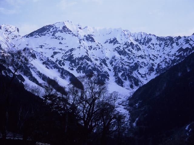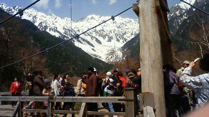 2日の夜東京を出て、先ほど帰ってきました。行き先は・・・・・行き先というか、出発地点ですけれど、まず着いたのは上高地です(ただし、この写真は帰路に撮りました)。松本電鉄の夜行バス「さわやか信州号」で行きました。例年だと、5月の連休は、2~3年ごとに北アルプスに行っています。例年だと、5月の連休前夜発の上高地行き夜行バスは、7~8台になるでしょうか。松本電鉄の観光バスだけでは足りず、他社の観光バスを動員することもあります。しかし、今年は4台でした。やっぱり震災の影響で、登山者も減っているのかなあ。かく言う私も、本当は涸沢に行こうかなと思っていたのですが、「涸沢は、もし大地震が来たら雪崩で埋まっちゃうよなあ」なんてことが頭をかすめてしまいました。それに、ゴールデンウィークの涸沢は、過去4回くらい行っているし、体力的にも、涸沢というのは上高地からとにかく遠い。最近ランニングをさぼり気味で体力低下中、しかも若干腰痛の気まであるので、今年はもう少し楽なコースと思い、徳本峠(「とくごうとうげ」と読みます)に行きました。かなり風が強かったのですが、徳本峠は樹林帯なので、テントに当たる風はそよ風程度でした。多分、涸沢ではすごい強風だっただろうなあ・・・・・・。若干曇り気味の白い空を背景にした雪山、というのは、さすがに携帯の写真では厳しいものがありますね。どこが稜線だかよく分かりませんけれど、一応、右端が明神岳、その隣が奥穂高岳、左寄りが西穂高岳です。こちらは明神岳のアップ。いずれにしても、一眼レフでも写真を撮ったので、ちゃんとした写真はしばしお待ちください。で、昨日は徳本峠から霞沢岳を目指したのですが、途中の急斜面であえなく撤退。(吹雪になってしまったし)今日は反対方向の大滝山方面を目指したのですが、30分ほど登った小ピークでトレースが消滅。樹林帯の中なので見晴らしがないので、トレースのないところを突き抜ける自信はなく、またも引き返しました。つまり、結局のところ徳本峠の周りをちょっとウロウロしただけで今回の山登りはおわってしまいました。上高地まで降りてきたら、今日の昼頃の時間帯はさすがに観光客が大勢いて、なかなかにぎわっていました。今回は、良い写真は少ないのですが、現像ができたら後日アップします。