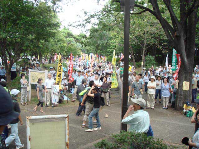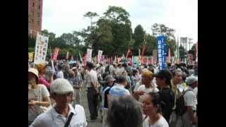 タイトルのとおりです。実は、昨日まで「さよなら原発」集会だと思っていて、このブログでもそう書いてきたのですが、実は間違いで「さようなら原発」が正しい名前でした。が、まあそれはそれとして、集会に一応参加し、デモ行進してきました。何故「一応」参加などと書いたかというと、会場は超満員で、集会の中身はほとんど見ることが出来なかったからです。そもそも、会場は総武線千駄ヶ谷駅下車の明治公園だったのですが、一駅手前で「反原発集会に参加の皆様、ただいま千駄ヶ谷駅は大変混雑しております。当駅から歩いても会場に行けますので」と放送しているような状況です。仕方がないので一駅手前から歩きました。たいした距離じゃなかったですが。これは、明治公園よりはだいぶ手前の国立競技場前の緑地(遊歩道)。この地点で既にかなりの人数が。明治公園、いやその前の道路は超満員。何とか明治公園の入り口まで来ましたが、すし詰め。すごい人数で、とても中には入れません。ステージは遙か彼方でした。ステージを望遠で撮影してみました。先ほどの入り口からは中に入れなかったので、坂を登って日本青年館前の高台にいってみました。ここからは公園内が見渡せました。上から見ても、やっぱり公園内が満杯です。ちょうど、この写真を撮っている頃に山本太郎がステージで演説していました。あと、制服向上委員会の歌もあったらしいです、私は見逃しましたけど。日本青年館前の高台。ここも明治公園の敷地なのかな。この場所だけはぎゅうぎゅう詰めではなく、場所に少しは余裕がありました。公園の反対側の入り口に回ってみました。ステージの脇付近です。駅から一番遠い入り口のせいでしょうか、入り口付近に人のいない空間が少しあって、なんとか公園内に入れました。それも5メートルくらい。その先は人の壁でした。反対側入り口の前の道路もこのとおりです。明治公園の広さは、だいたい100m四方くらい、日本青年館前の高台は100m×50mくらいのようです。つまり、1万平米と5000平米。そこから計算すると、多分会場内だけで3万人近くいたんじゃないでしょうか。会場に入り切らなかった人は、正確には分かりませんが、会場内の人数より多かったかも知れません。大通りの反対側にまで人が溢れていましたから。発表によると、集会参加者数は6万人とのこと。私の体感では、もっと多そうな気もしましたが、まあだいたいそんなものなのでしょう。毎日新聞のサイトに、ヘリコプターから会場を撮影した写真がありました。http://mainichi.jp/select/wadai/graph/20110919/1.htmlで、集会の後デモ行進に移ったわけですが、そんなわけで、集会参加者が多いものだから、隊列の長いこと長いこと。2時間は待ちました。しかも、デモは1コースではなく3コースに分かれていましたからね。実は、ケーナを持っていって、吹きながら歩きました。ただ、風が強くて、息が飛ばされがちでちょっと音が出しにくかったですけど。野外でケーナを吹くときは、風下を向いて吹くようにしているのですが、さすがに歩きながらの場合は、前を向くしかないですからね。諸事情により、デモ行進の写真は撮りませんでした。なので、デモの写真は新聞サイトより。↓読売新聞