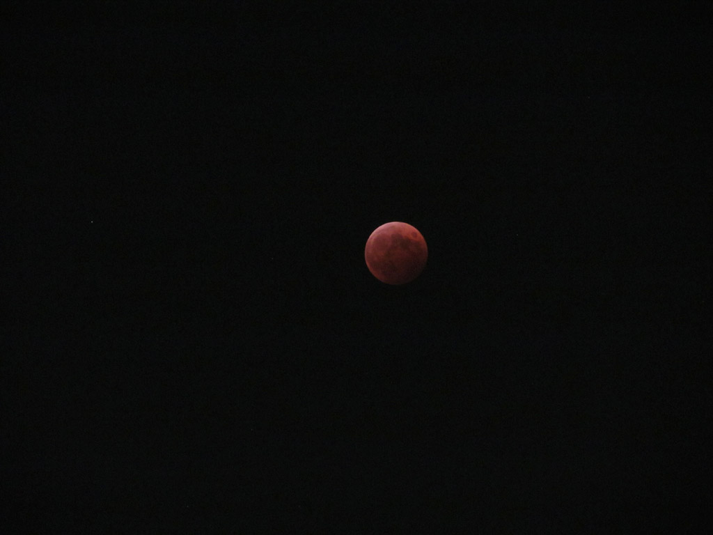 月食は、皆さん、見られましたか?以前、2011年にも皆既月食があり、そのときも撮影したのですが、あまりうまく行きませんでした。三脚は使ったのですが、シャッターを押すときにどうしてもカメラが揺れてしまい、手ブレが発生するのです。かといって、コンパクトデジカメではレリースは使えないし・・・・・・と、思っていたのですが、あることに思い当たりました。レリースなんかなくたって、タイマーを使えばいいじゃん。実に簡単なことです。というわけで、今回試してみました。しかし、実は近所にマンションが建って、階段の電気が煌々とついていて、空が明るくてしょうがない。でも、何とか撮影できました。一番の問題は、なかなかピントが合わないこと。シャッター半押しで何度も何度もピントを合わせて、その度にエラー。10回に1回くらい、やっと゜ピントが合うのです。それでも何枚か撮影しました。それでも、おそらくピントが正確には捉えられていないためでしょう。ピクセル等倍で表示すると、どうもピンボケな写真になってしまいます。以前に撮影したときよりは、はるかにマシですけど。このくらい縮小すれば、ピントが合っているように見えます。この写真も同様。しかし、ちょっとアップにすると、ぼやけてきます。これが原寸大。残念ながら、ちょっとボケてしまいます。何しろ3年前に2万円未満の値段だったコンパクトデジカメですから、このあたりが限界というところでしょう。