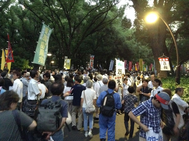 <安保法案>「戦争させない」2万人超が反対集会15日の安全保障関連法案の衆院特別委員会採決を前に、法案に反対する市民らが14日、東京・日比谷野外音楽堂で集会を開き、「戦争法案の廃案を」「強行採決は絶対反対」などと訴え、国会周辺をデモ行進した。集会は「戦争させない・9条壊すな!総がかり行動実行委員会」が主催。日比谷の会場には2万人以上(主催者発表)が詰めかけた。野党国会議員や作家が登壇して「安倍政権の暴挙と闘う」などと気勢を上げ、プラカードやのぼりを手にした市民の熱気に包まれた。福岡県八女市から夫婦で参加した無職(62)は「3歳の孫が大きくなったときに戦争に行くことがないようにしたい」と力を込めた---私も、参加しました。遅れて行ったので、野外音楽堂は満員でぜんぜんは入れませんでしたが、デモ行進には参加しました。本日衆議院で採決だといいます。参議院は、60日ルールで採決できなくてもやり過ごす算段のようです。議論を尽くすのではなく、国会の数の力で押し通そうということです。断固として反対です。