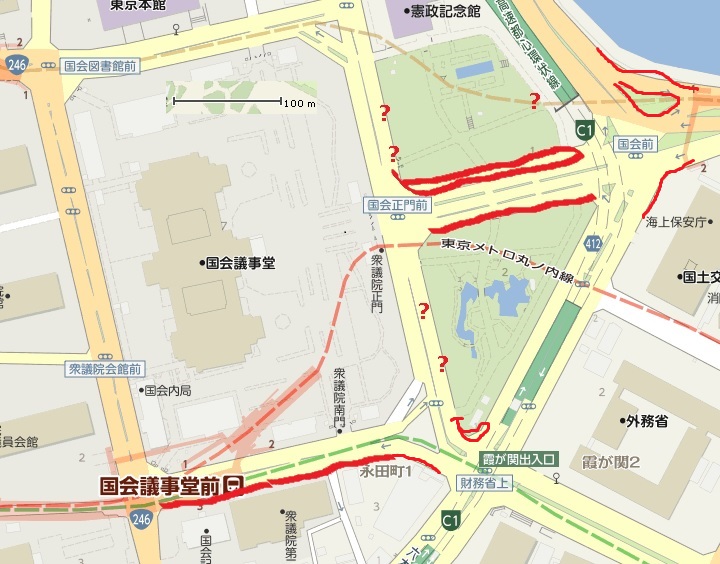 礒崎陽輔ツィート国会前に6万人、10万人、11万人の市民が押し寄せたという報道がありましたが、警察発表では5千人未満ということだそうです。道路にあふれない限り、そんなに多くの人がいる場はありません。---安倍政権としては、国会前の抗議行動を少しでも過小評価してごまかしたいところなのでしょう。なお、近年この種の集会の参加者数に関して「警察発表」はありません。ただ、警察関係者かに非公式に数字がマスコミにリークされるようです。そして、主催者発表と警察の非公式リークで、参加者数が大きく違うのはあらゆる集会、デモでほぼ常態となっています。私自身の判断では、主催者発表はその時々で違いますが、確かに時々「水増しされているな」と思う場合があります。一方で、私の体感と大きくは異ならない数字であることも少なくない。一方警察の非公式発表はというと、だいたいいつも、私の体感より少ない。たとえば、今回の国会前抗議行動もそうです。あえて言えば、確かに6万人というのは、ちょっとどうかな、そんなにいたかな、というのは私も疑問に思います。一方で警察の非公式発表※は6~7千人だそうですが、これもまた、きわめて怪しい数字といわざるを得ません。磯崎は5千人未満と書いていますが、様々なソースを総合すると、実際には警察は6~7千人と言っているようです。それこそ、磯崎は警察発表の捏造すら行っているこの日、つまり15日、私は国会前に7時過ぎに行きました。最初は官邸前、ここは人があまりいませんでした。おそらく200人か300人かくらい。そのあと、規制線だらけで移動に時間を要しましたが、国会の正面に着いたら、ここはものすごく人が多かった。ただし、私が到着したのは8時を過ぎた頃で、たまたま知人に遭遇したのですが、その前の時間はもっと多かった、ということです。この地図の、国会正面からの道路の右側、歩道から一つ目の分離帯までが人でいっぱいでした。この幅は、ヤフー地図で大雑把に計ったところ、12~13m程度のようです。私が到着した時点では、その途中からでしたが、その前の時間帯はこの道路の端まで人でいっぱいだった、とのことです。距離は170~180mありますから、面積は2000平米以上となります。私の体感で言うと、ここの混雑率は、朝の通勤電車よりはマシ(その中を、かろうじてではあるが、移動できた)、しかし帰宅時の通勤電車とは大同小異、くらいの感じでした。乗車率100%以上150%以下程度です。山手線の車両は、長さ20m、幅2.95mで、乗車率100%で定員162人(中間車)です。つまり面積59平米に162人、1平米あたり2.7人となります。1平米あたり3人とすると、この場所だけで6000人です。もちろん、道の反対側の歩道にも大勢の人がいました(ただし、反対側では車道まではみ出してはいなかった)。歩道は幅5~6mですから、2000人くらいでしょうか。そして、国会に面した歩道(地図で?と書いてある面)。ここには近付けなかったので、どのくらいの人がいたのかは分かりません。ただ、警察が「こちらはもう人がいっぱいで入れません」と言って阻止線を引いており、進もうとする人たちと押し問答になっていました。夜でしたから遠方まで見通せたわけではありませんが、実際阻止線の先にも多くの抗議者がいることは視認で来ましたから、おそらくは警察の言うとおり、満員だったのでしょう。ここは、距離が300mくらい、歩道の幅が5mくらいですから、先の乗車率の計算からは4000~5000人と推測できます。その他、地図で赤線を引いたあたり、そして赤線は引き忘れましたが財務省上にも、ある程度の人がいました。行っていませんが、おそらく自民党本部前にも、相当数の抗議者がいたのではないでしょうか。これらを合計すると、1万数千人というところでしょうか。ただし、これは同時的に国会周辺の抗議行動に参加していた人の数です。何度も書いているように、私が現地に到着したとき、どんどん帰る人がいた一方、新たに参加する人もどんどん来ていました。抗議行動の開始時間は一応あったようですが、終了時間は明確ではなく、タイムスケジュールがあるわけじゃないので、みんな好きなときに来て好きなときに帰るわけです。したがって、延べ人数は同時的な参加者数よりはるかに多かったはずです。どの程度なのかは、まったく分かりません。主催者にも分からないでしょうし、警察にも分からないでしょう。間違いないのは、いくらなんでも5回転も6回転もはしていないだろう、つまり10万人は水増しに過ぎるだろう、ということはいえます。しかし、警察の言う6~7千人もまた、明らかに過少な数字です。おそらく、その実態は、入れ替わりも含めて3万人前後というところではなかったかと思います。追記 私は、自分が土日休みのサラリーマンだから夜の抗議行動のことしか頭になかったけど、考えてみればこの日は朝から抗議行動をやっていたのです。朝から夜まで通しで参加した、という人は主催者関係者以
