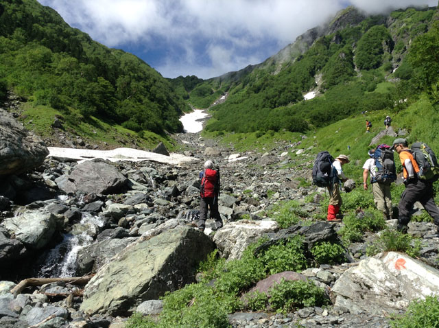 日本で2番目に高い山、南アルプス(赤石山脈)の北岳に登って来ました。実は、北岳に登るのはもう6回目なのですが、前回登ったのは2004年なので、11年ぶりでした。事前の天気予報は、金曜日はあまりよくない予報でしたが、ふたを開けたら、まずまずの天気でした。例によって、後日フィルム一眼レフの写真をアップしますが、とりあえずiPad miniの写真を。コースは、前夜最終の特急「かいじ」で甲府に深夜到着、始発のバスで広河原着が6時半過ぎ。広河原からは大樺沢→八本歯のコル→北岳山荘(テント設営)→間ノ岳まで往復(ここで宿泊)→北岳山頂→肩の小屋→草すべり→白根御池小屋→広河原テントだったので、荷物は登りはじめの時点で16kgくらいありました。(下山した時点では水と食料が減っているので、2kgくらいは軽くなっていたはず)大樺沢です。大樺沢を上から見下ろしました。朝は晴れていたけど、この時間は少しガスが出て、日はかげっていました。昔の記憶では、大樺沢はすごい大雪渓のように思っていたのですが、こうやって見ると、それほどでもなかった。北アルプスに比べれば、南アルプスの積雪量は格段に少ないですからね。大樺沢から八本歯のコルまで、ひたすら階段です。何箇所だったか、数えていないけど、数十回出てきました。この場所を登ったのは、おそらく2001年以来なので14年ぶり。階段はあったけど、こんなに多かったかなあ。記憶違いか、近年整備されたのかは分かりませんけど。北岳山頂直下の巻道。高山植物のお花畑が丁度満開。写真はシナノキンバイの群落です。ただ、花の写真ばかりはiPad miniではマトモに写らないのです。花の写真はフィルム写真をお待ちください。北岳山荘には2時頃到着、テントを設営して、しばし休憩の後、3時頃間ノ岳に向かいました。写真は北岳山荘から北岳を撮影したものです。間ノ岳は標高3189m、北岳より4m低い、日本で4番目に高い山です。山頂には4時10分少し前に着きました。山頂には誰もおらず、独り占め状態です(ただし、帰りに3人ほどとすれ違いました)。写真は農鳥岳方面を撮影したもの。同じく間ノ岳から北岳方面を撮影しました。で、翌朝です。天気は良かったのですが、風が非常に強く、テントの撤収時に風にあおられて、ポールを曲げてしまいました(涙)。まだ3回しか使っていないのに。もっとも、使用には問題ないレベルです。富士山の夜明け。稜線上は激しい風が続く中、テントの重い荷物を背負って、北岳山頂に向かいます。山頂に着いた。6時何分だったか忘れましたが、北岳山荘から1時間ちょっとでした。仙丈岳。その右手奥に、この写真では分かりにくいですが北アルプスの槍穂高連峰が見えます。眼下に、今朝の出発点北岳山荘が見えます。そして先には昨日行った中白峰と間ノ岳。その左奥には農鳥岳、右奥には塩見岳。山頂を越えて北岳肩の小屋まで下ってきました。ここで標高がちょうど3000m。前回2004年に登ったときは、ここにテントを張ったのでした。肩の小屋から中央アルプスを望む、その手前に伊那谷の町並みがちょっと見えます。肩の小屋から更に下っていったあたりで、小太郎尾根の続く稜線の向こうに甲斐駒ヶ岳が見えます。甲斐駒の右奥は八ヶ岳。北岳山頂を振り返り。肩の小屋も小さく見えます。(稜線がえぐれている底の付近)鳳凰三山(地蔵岳・観音岳・薬師岳)草すべりの一番上部。シナノキンバイとハクサンンイチゲの大群落が広がっていました。写真にはハクサンイチゲは写っていません。左奥にナナカマドが花を咲かせているのが少し写っています。ここから先、白根御池までは急降下につぐ急降下。すごい斜度です。テント装備が重い。スリップして尻餅をついてしまいました、白根御池小屋に着きました。ソフトクリームがおいしい。で、ここから広河原への下りが、またまたものすごい急降下の連続。草すべりの急登は記憶にあったけど、白根御池より下も、こんなにきつかったっけ??よれよれになりつつ、やっと広河原に到着したのが12時20分頃。白根御池を出たのが10時20分頃だったので、ちょうど2時間。広河原山荘で昼食。昼間から生ビールを飲んでしまいました。おいしかった!!ちなみに、北岳山荘は稜線上で携帯電波がつながりました。北岳山頂でも同様。しかし、白根御池ではかすかにしかつながらず(メールは受信できたが写真のアップロードはできず)、広河原でもつながりませんでした。