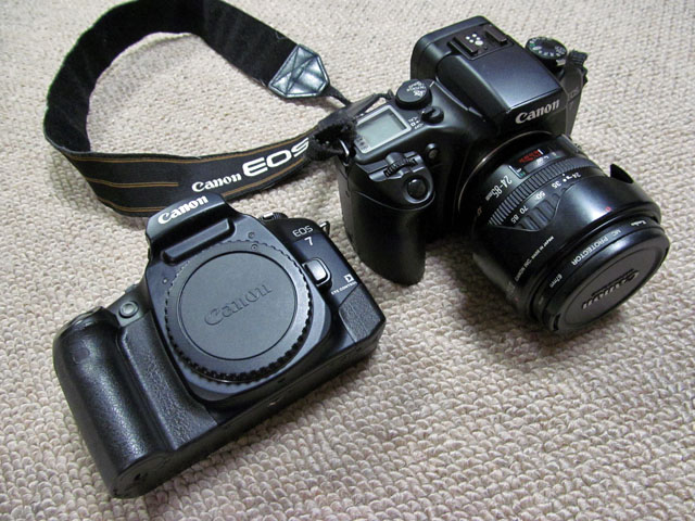 常々当ブログで書いているように、私はいまだにフィルム一眼レフを常用しています。いつまで常用するか分からない状態ですけど。元々は、1999年にキヤノンのNEW EOS KISSとセットのレンズ(EF28-80mm F3.5-5.6)を買ったのが、私の一眼レフの最初でした。今は、このどちらも売却してしまい、手元に残っていませんが。現在使っているのは、EOS7で、2台あります。2000年に発売されたもののようです。私自身が1代目を購入したのは2003年で、中古品でした。どっちが2003年に買ったほうかは、覚えていません。中古価格で4万円前後だったように記憶しています。実は、このカメラを岩にぶつけて壊してしまったため、2005年にもう1台買ったのです。それも中古で、そのときは3万円を切っていたと思います。ちなみに、現在は中古価格を調べたところ3000円台のようです(笑)壊れたから2台目を買ったのに、結局壊れたほうも修理してしまい、同じカメラが2台になりました。なので、そのときにNEW EOS KISSと付属レンズは売却したと思います。重さは電池込みでも500g台で、さほど重過ぎず、私にとっては非常に使いやすいカメラです。背面です。一方、現在常用しているレンズはEF24-85mmF3.5-4.5というレンズですが、これはEOS7より前、2001年に購入したものです。EOS KISSとセットのレンズより、いいレンズを使ったほうがいい写真が撮れるんじゃないか、という、後から考えると危険な考え(笑)が頭に浮かんでしまったのです。こちらは新品で購入したもので、値段はまったく覚えていませんが、当時3~4万だったのではないでしょうか。広角側が、それまで使っていたレンズは28mm、このレンズは24mmです。たった4mmの違いで、ずいぶん広く撮れるようになるんだな、とびっくり。2001年12月のボリビア旅行は、すべてこのレンズとNEW EOS KISSとの組み合わせで撮影しました。そのとき以来、ずーっと、山ではこのレンズを常用しています。もう、かれこれ15年近く使っています。EOS KISSとセットのレンズよりは上のランクとはいえ、そんなに高級なレンズではないと思いますが、わたしにとっては必要充分なのです。重さも380gと軽い。もっとも、広角端の24mmは、最初のうちはワイドぶりにびっくりして多用しましたけど、ふと気が付くと、最近はワイド端はそれほど使っていません。自分でも理由はよく分かりませんが、やたらと広角でいろいろなものを1枚の写真に収めても、そんなにいい写真にはならないから、でしょうかね。しかし、今でもこの広角が役に立つことが、時々あるのです。80-200mmの望遠ズームレンズです。値段は覚えていませんが、比較的安価なものだったと記憶しています。いつ買ったかも覚えていませんが、2001年前後だったと思います。何回かは山にもって行きましたが、山の風景写真で200mmの望遠レンズは意外にそれほど使わなかったのです。いや、実際のところは荷物を担いでレンズ交換が面倒だっただけですけど。登りで息が上がっているときは、ザックを担いだままカメラが構えると、200mmは手ブレになりやすい、ということもあります。(荷物が重いので、三脚は山にはほとんどもっていったことがありません)そんなこんなで、近年はこのレンズは山には全然持っていっていません。ほぼ子どもの運動会撮影専用と化しています。EOS7の1台目を買ったときか2台目を買ったときか忘れましたが、それと同時に買ったEF50mm F1.4 USMという単焦点レンズです(中古)。ズームレンズより単焦点のほうが画質がよい、という話を聞いたのと―ますます危険な方向です(笑)、室内で子どもの写真を撮るのにF3.5では厳しかったので、これを買いました。非常にいいレンズなのですが、F1.4まで開くと、被写界深度が極度に浅いのです。子どもの鼻にピントが合うと目はぼけている、くらいに。F1.8以下に絞れば、被写界深度はある程度深くなります。数字以上に明るいレンズで、前述のEF24-85mmF3.5-4.5とこのレンズを同じ焦点距離、同じ絞りにそろえてシャッターを切っても、こちらのほうがシャッター速度が速いのです。写真の明るさは絞りと焦点距離だけでは決まらないんだ、と思い知らされました。ただし、晴天の山ではそんなに明るいレンズは必要ないし、風景写真はできるだけ被写界深度が深いほうがいいので、このレンズを山に持っていったことはありません。そして、コンパクトデジカメを買ってからは、室内で子どもの撮影はデジカメに置き換わってしまったので、最近はこのレンズの出番がほとんどありません。カメラマニアの中には「レンズ沼」という言葉があるそうで、あのレンズがほしい、このレンズがほしいと、新しい、高級なレンズを次々と買う人も多いと聞きます。ここまでの勢いでは、私もそうなりかねないところだったかもしれませんが、何故かここでパッタリと、新しい(中古も)レンズを買わなくなりました。一時期、100mmの単焦点マクロレンズがほしいなあと、中古を物色したことがあるのですが、結局買わなかった。そ