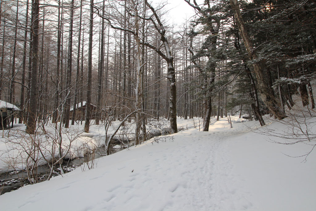 昨日の続きです。小梨平のテント場、夜中は満天の星空で快晴だったのですが、明け方に近くなると、テントに何かが降り注ぐ音が。覗いてみると、いつの間にか雪が降り出してしまいました。あーあ、という感じです。5時に起きて6時に徳本峠に向けて出発する予定でしたが、うっかり寝過ごしてしまい、気が付いたら6時。しまった、とは思ったのですが、テントの外は相変わらず吹雪。こりゃ、とても徳本峠まで行けそうにないので、あまり「しまった」という気分にもならず、テント内でもたもたしていたら、急に外が明るくなってきました。見ると、晴れ間が出ている。こりゃ大変、朝食(インスタントラーメン)、テント内片付け(戻って来たら即撤収なので)ののち、出発したのは7時20分過ぎ。この時点で、もう徳本峠までたどり着くのは無理だろうという感じでした。小梨平から明神へ向かいます。カラマツ林に日差しがあります。頭上は晴れてきたのですが、穂高連峰は相変わらずガスの中です。明神岳が目の前のはずですが。明神館前に着きました。ここまでは、人が大勢歩いていました。トレースはかなりしっかりついていて、アイゼンもワカンもスノーシューも必要ない状態です。しかし、ここから徳本峠に向かう道に入った途端に、人がいなくなります。スノーシューで歩いた踏み跡はあるのですが、踏み固められているわけではないので、ツボ足だとズボズボと潜ってしまいます。そこで・・・・・・ワカンの登場です。これでしばらく進みましたが、次第に斜度が増してきました。ワカンだけだと滑るようになってきたため・・・・・・更にアイゼンも装着しました。もっとも、ワカン+アイゼンって、そんなに歩きやすくはないのです。上り下りはまだしも、トラバース(雪の斜面を横切る)はどうも歩きにくい。ウサギさん、どこに行くの?ひたすらのぼりが続く。写真左手に数人の登山者が写っています。実は、先行するトレースは、彼らがつけたものです。ここで引き返すそうで、雪の上でエビスビールで乾杯していました。ということは、この先はトレースなし。いや、正確に言うと、前日かその前にとおったらしい踏み跡が、昨晩から今朝にかけて降った雪の下に、所々うっすらと見えるような、見えないような。まあ、迷うようなところではないので、このまま先に進みます。歩き出したときから、テント撤収して帰宅する時間、日中気温が上がった場合の雪崩リスクなども考えて、10時半に引き返そうと考えていました。その10時半の時点で着いた場所がここです。峠はまだまだ遠いですが、今回はここまで。眼前の穂高連峰は、相変わらずガスの中ですが、視界はあります。私の前に踏み跡なく(いや、前日以前の踏み跡はありましたが、この日は私以外にここまで登ってきた人はいないようで)、私の後には自分自身のワカンの踏み跡がひとつだけ。しかし、それにしても結構雪崩の跡も散見され、気温に高いときと降雪直後は登りたくないなあ。登りは明神館からここまで約2時間、しかし下りは1時間でした。明神館まで戻ってきました。下りでもう一人すれ違ったので、この日と徳本峠を目指したのは、写真の団体と私とその1人、合計3パーティーだけだったようです。明神までは大勢の入山者がいるのに、徳本峠に向かう人はほとんどいないようです。ここで、ワカンもアイゼンも外しました。小梨平に戻ってテントを撤収、今度は県道上高地線を下山します。荷物は登り20kg、下りは水と食料をほとんど消費したので17kgくらいになったはずですが、ちっとも軽くなった感触がない。ザックが肩に食い込みます。大正池に到着。大正池から下は道路が除雪されています。この雪の壁が1mあまりです。道路は除雪されているといっても、積雪0ではなく、10cmか20cmは雪があるので、あわせると積雪130cmか140cmくらいでしょうか。大正池。目の前に穂高連峰があるはずなんですが、やっぱり見えませんね。