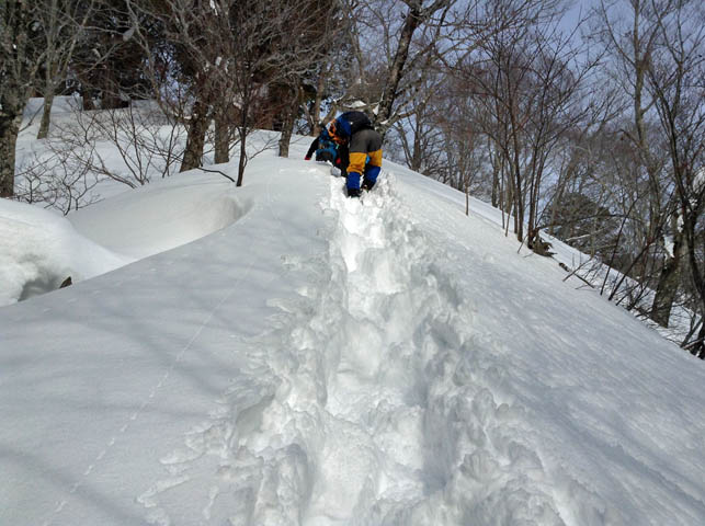 「幅50メートルにわたり雪崩」=NPO法人現地調査-スキー場8人死亡事故・栃木栃木県那須町で雪崩が発生し高校生ら8人が死亡するなどした事故で、NPO法人「日本雪崩ネットワーク」が28日、那須山岳救助隊の依頼を受けて現地調査を行った。取材に応じた出川あずさ理事は、雪崩の規模について「幅50mにわたり、厚さ40~50cmの雪が動いた」と分析した。出川さんは同日午前6時半ごろから現場のスキー場に入り、約3時間にわたり雪の状態などを調査。高校生らが埋まった現場から目視で、雪崩発生地点を特定し、流れた雪がたまった「デブリ」も確認した。雪が割れた破断面は確認できなかったが、雪の状態などから幅50m、厚さ40~50cmの雪が動いたとした。縦にどれくらい動いたかはGPSを使って今後分析するという。現場は雪崩が起きやすい地形で、その真下を休憩場所として選んだために、多くの生徒が巻き込まれたと説明。短時間に大量に雪が降った直後で、雪の状態が不安定になっていたとの見方を示した。---なんとも痛ましい事故が起こってしまいました。栃木県の那須高原で、高校生の春山安全講習会で、まさかの雪崩による8人の死亡事故です。実は、私は先日上高地に行く前、「どこの山に登ろうか」と考えていた候補がいくつかあったうちのひとつが那須でした。天気が安定していれば、茶臼岳は簡単に登れる冬山入門の山とされているからです。結局、「やっぱり北アルプスがいいかな」と思って上高地にしてしまいましたが。上高地でも、3月という時期と積雪量から、雪崩の可能性は常に意識して、徳本峠(雪崩があり得る場所です)の一番上までは行かずに引き返しました。(帰宅時間との兼ね合い、という面もありましたけど)でも、那須は昨年5月に登ったのが初めてで、そのときは積雪皆無でした(昨シーズンは記録的暖冬で雪が少なかった)。まだ積雪期の那須に登ったことがないので、那須がそれほど雪の多い山域とは思っていませんでした。だから、那須岳で雪崩の可能性というのは、今回の事故までは考えたことはありませんでした。それに、スキー場で雪崩というのは、普通はあまり考えないものです。ただ、スキー場で雪崩が起きないのは、圧雪されているからです。しかし、現場の那須ファミリースキー場は、20日に今シーズンの営業を終了したそうです。それ以降は、新たに雪が降っても圧雪などはしていなかったのでしょう。圧雪された雪の上に新しく新雪が積もった状態は、かなり雪崩の起きやすい条件です。そもそも、こちらの記事によると、雪崩の発生地点はスキー場のコース外だったようですが、やはり凍った古い雪の上に新雪が積もり、表層雪崩が起きやすい条件だったそうです。この件で、主催者側にどの程度の責任があったのかは、現時点では私にはよく分かりません。※ただ、8人もの前途ある高校生が亡くなってしまった事実は、責任の程度がどうであれ、とてつもなく重いと言うしかないでしょう。仮に不可抗力だったとしても、関係者は一生重荷を背負っていくことになるのだろうと思います。※追記2に記しましたが、その後雪崩現場の地形図が明らかになりました。この地形で雪崩のリスクを考えなかったとするなら、相当に問題がある判断と言うしかありません。実際のところ、雪崩の現場の写真はいずれも航空写真なので、現場の斜度が分かりにくく、雪崩の危険性が明白な地形かどうか、私にはよく分かりません。↓この写真だと、現場の斜度は分かるのですが、この写真のどこで雪崩がおきたのかがよく分かりません。雪崩の場所は奥の樹林帯のどこかではあるのでしょう。そうすると、あの程度の標高差、樹林帯の中であることを考えると、「雪崩が極めて起きやすい地形」とは認識しなかったとしても仕方がない気はします。---追記1毎日新聞に別の写真が出ています。2枚の写真を照合すると、茶臼岳(上の写真の右側の樹林が切れた一番高い山)で発生した雪崩が、樹林帯の切れ目付近にいた高校生に直撃したようです。樹林の切れている、斜度のある雪面では、確かに雪崩リスクは高そうです。別記事によれば、雪崩に巻き込まれた人たちは尾根付近にいたそうです。普通は尾根上は雪崩に巻き込まれるリスクは低いと考えられますが、尾根と言っても幅が広くて、雪崩発生地点からの距離も短ければ、直撃されることもある、ということなのでしょう。※※追記2に記したように、地形図で確認する限り、実際には雪崩遭遇現場は、尾根ではなく単なる斜面のようです。---追記2(4月1日)たかさんへのコメントの過程で検索したところ、日本雪崩ネットワークのホームページに、さっそくこの事故の報告が掲載されていることを発見しました。それによると、赤い点線が問題の雪崩のコース、緑の点線が高校生たちが登ったコースで、赤い輪の辺りで雪崩に遭遇、青い点線は後日の別の雪崩だそうです。さらに、現場の地形図はこうなっています。この地図は、目からうろこ