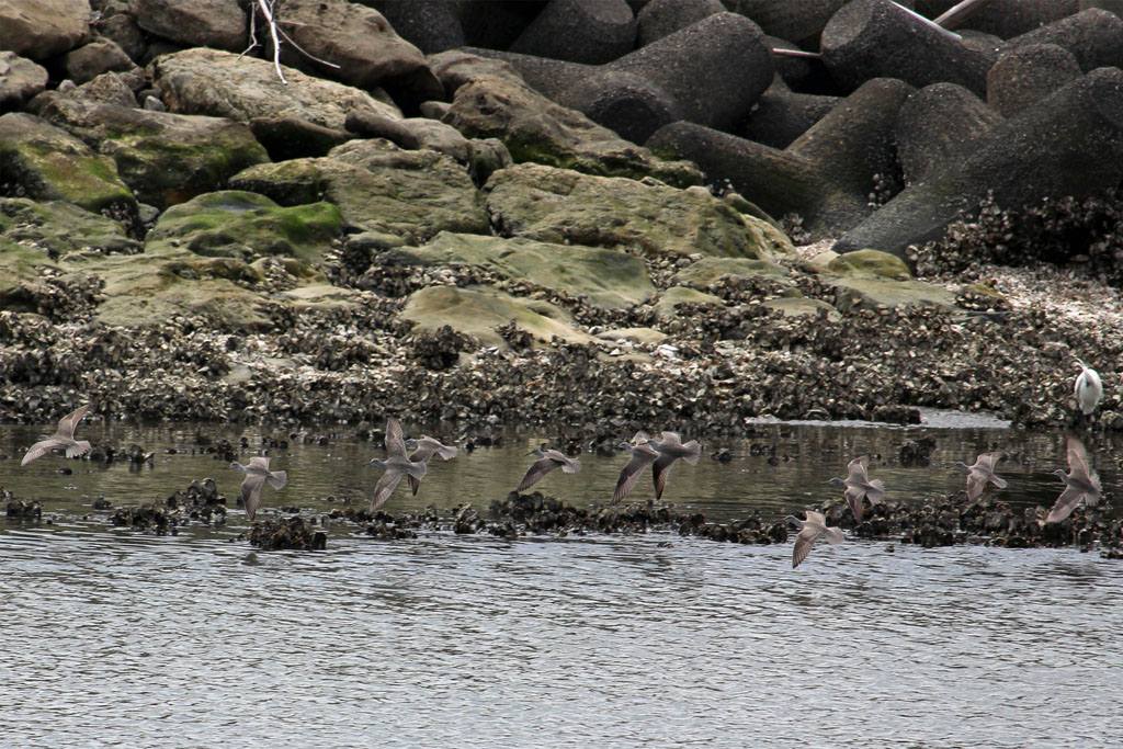 シギ・チドリまつりって、ネタで考えたのですが、なんと実際にそのようなイベントが4日と5日に行われたそうです。というわけで、連休最後の1日、東京は朝9時過ぎが干潮時間だというので、午前中(最低潮位時間には少し遅れましたが)葛西臨海公園に行ってきました。同じことを考えていた人は多いようで、バードウォッチャーは結構多かったです。みんな、私よりよほどでかい望遠レンズを持っていましたが。まずは西なぎさよりキアシシギの群れが飛来しました。実は、うっかりして双眼鏡を持ってくるのを忘れてしまいました。シギって概ね茶色か灰色で、背景(カキ礁)の色に溶け込んでしまうのです。一眼レフの望遠レンズのファインダーでは、動かないと全然分からなくて、探すのに苦労しました。まだしも肉眼の方が視界が広いので、「動くもの」はカメラのファインダーよりは見つけやすかったです。というわけで、鳥の種類を書いていますが、その場では「シギの仲間」という以上の種類はまったく分からず、帰宅後に図鑑等で確認しました。一部、他の人が口にしていた名前を聞いていたものもありますが。また、シギの仲間って、みんなよく似ていて、区別が難しいのです。コアジサシ。水中の魚に向けてダイブした直後。コアジサシ。アジサシの仲間って、先端の尖った翼と、深くくびれた尾羽、ツバメとシルエットがそっくりです。飛び方も似ているし、飛翔速度も速い。違うのは、ツバメは前を向いて飛んでいるけど、アジサシの仲間は水中の餌を探して、下を向いて飛んでいることが多いところでしょうか。分類上は、アジサシはカモメの仲間、ツバメはスズメ目ですから、まったくかけ離れています。チュウシャクシギ。全長40cm前後で、くちばしが下向きに湾曲しているのが特徴です。(多分、チュウシャクシギで間違いないと思います)ダイサギ西なぎさに群れている鳥を撮影したら、偶然ミヤコドリが飛んでいるのが写っていました(写真左下)。加えて、遠方で立ったまま翼を広げている鳥(カワウ)の両側にいる数羽の鳥もミヤコドリです。その他、アオサギ、ハシブトガラス、ユリカモメが写っています。いただきます♪チュウシャクシギがカニらしき餌をくわえた瞬間。コサギ。足の指だけが黄色いのがはっきり写っています。右はチュウシャクシギ(くちばしは下向きに湾曲)、左はおそらくオオソリハシシギです(くちばしはわずかに上向きに反っている)。こちらも同じく、右はチュウシャクシギ、左はオオソリハシシギです。コアジサシの団体様が到着です。・・・・・・どうも、コアジサシだけでなくアジサシも混ざっているような気がするのですが、確証はありません。カワウの団体さんもお着きです。上に飛んでいるのはユリカモメの若鳥。キョウジョシギ。まだカンムリカイツブリが残っていました。カモ類もほとんど北に去りましたが、まだスズガモが数十羽残っています。残っているのか、もっと南から渡りの途中で立ち寄ったのかは分かりませんが。ここから、鳥類園内に移ります。観察窓越しなので、かなり近い位置から撮影できるのがメリットです。ハマシギコチドリキアシシギ。すぐ近くまで来たので、アップで写真が撮れました。今日見られた鳥はチュウシャクシギ、オオソリハシシギ、キアシシギ、キョウジョシギ、ハマシギ、コチドリ、コアジサシ、アジサシ(確証なし)、ユリカモメ、ミヤコドリ、ダイサギ、コサギ、アオサギ、オオバン、カワウ、カンムリカイツブリ、スズガモ、ホシハジロ、カルガモ、キジバト、ハクセキレイ、スズメ、ムクドリ、ハシブトガラス、ヒヨドリ、ツバメ。声のみ確認はシジュウカラとオオヨシキリでした。